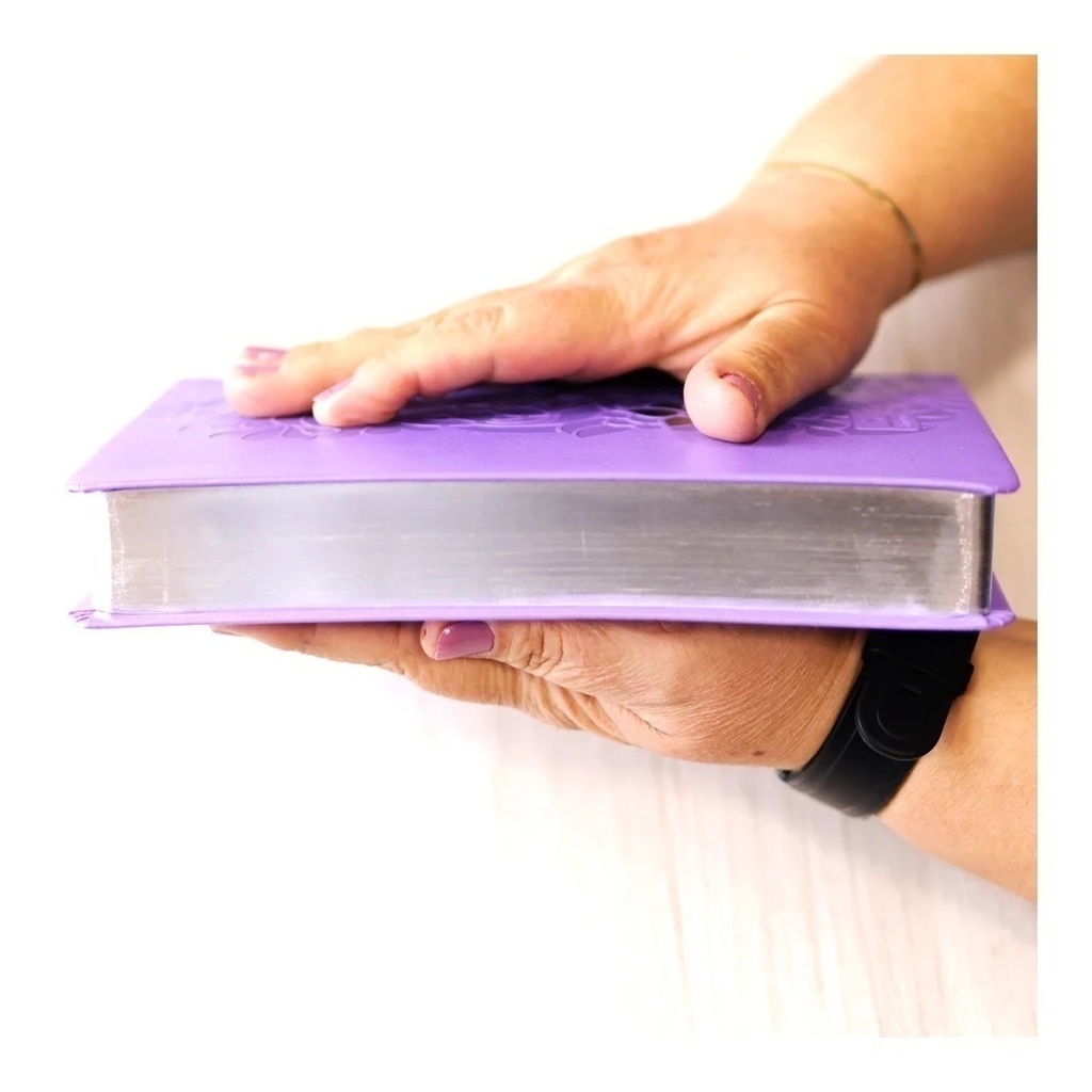 Esta edição traz as palavras de Jesus em vermelho e texto com destaques coloridos, auxiliando a localizar temas importantes sem perder a sobriedade do projeto gráfico. A capa lilás com flores confere elegância e resistência, ideal para o uso diário e para levar aos cultos e estudos.